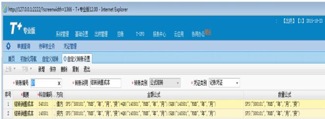 2、在表體中,科目列第一行選擇“主營(yíng)業(yè)成本“,方向“借方“,第二行選擇“庫(kù)存商品“科目,方向”貸方“,點(diǎn)擊數(shù)量公式列,兩行數(shù)量公式中都錄入SFS(“500101”,”RMB”,”年”,”月”,”貸”);