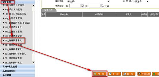 登錄銷管系統(tǒng)http://upsale.yonyou.com/ 在左樹分類【審批業(yè)務(wù)】下,點(diǎn)擊選擇【特殊銷售錄入】。在打開的右側(cè)區(qū)域點(diǎn)擊按鈕【增加】,如下圖。