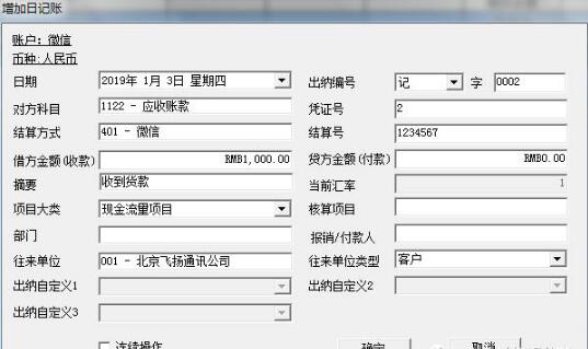 第一步,增加微信或者支付寶日記賬(本文以微信為例)。點擊銀行日記賬,選擇微信賬戶和期間,點擊確定,如下圖。