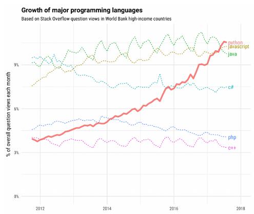 其中一個(gè)是 python,它最常用于 AI 和 ML 開(kāi)發(fā)。下圖是一個(gè) Stack Overflow 的統(tǒng)計(jì)圖,詳細(xì)描述了這一趨勢(shì)。