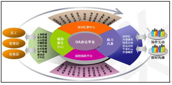 OA協(xié)同辦公系統(tǒng)主要面向組織中的業(yè)務(wù)管理層,為各種類型的文案工作提供支持,通過應(yīng)用信息技術(shù),支持辦公室的各項信息處理工作,協(xié)調(diào)不同地域之間、各職能間和各信息工作者間的信息聯(lián)系,提高辦公活動的工作效率和質(zhì)量。不同組織中的辦公業(yè)務(wù)是不同的,所以,不同辦公系統(tǒng)有很大的區(qū)別,但一般情況下,OA辦公自動化系統(tǒng)都具有通過文字處理、桌面印刷、電子化文檔進行文檔管理;通過數(shù)字化日歷、備忘錄進行計劃和日程安排;通過桌面型數(shù)據(jù)庫軟件進行數(shù)據(jù)庫管理;通過電子郵件、語音信箱、數(shù)字化傳真和電視會議等形式進行信息聯(lián)絡(luò)與溝通的功能。